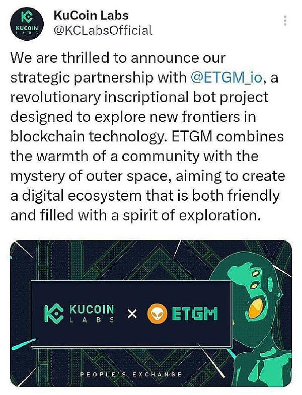 1月15日全球知名交易所KuCoin Labs正式宣布与多链铭文机器人ETGM建立战略合作关系。