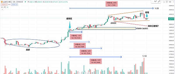 他到这根K线开始算是一个盘整区 然后拉到这根K线13天开始突破 然后也是从这根K线到21天他也是斐波拉契数列 或者是到34天这里 包括上一次的55天 所以现在我认为我们尽量去观察比特币在1月22号 也就是从之前的K线这里开始计算 我们到时候观察一下在这个位置会不会有一个上涨