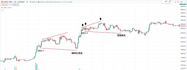 因为我们可以观察一下比特币在2023年初起来的一波上涨 其中有几次低点的买点都是在喇叭口 包括2023年的3月份 也是高点在不断的创高 那么这些形态就是骗一些散户追在这些高位 然后洗盘下来又骗散户追高的这些人 卖在这种低点的位置