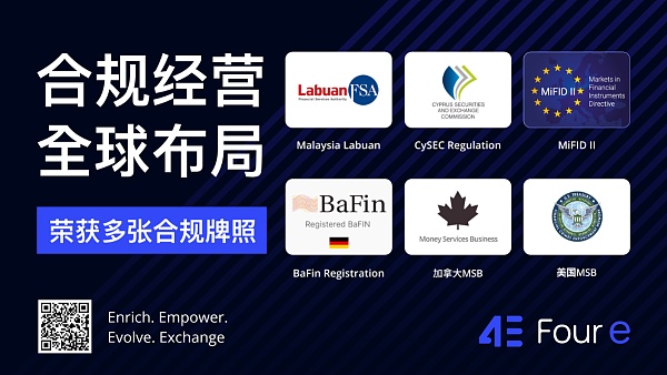 4e Exchange 平台积极主动谋求全球合规运营,取得了一系列突出成果。目前平台已经获得Malaysia Labuan、CySEC Regulation、MiFID II、BaFin Registration、MSB Canada、MSB U.S.A等多国金融牌照,为客户带来全方位的资产安全保障,成为业界极少数积极拥抱合规的代表。