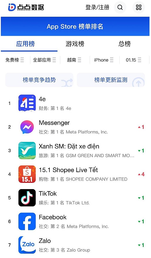近日,知名数据公司“点点数据”平台最新显示,4e Exachage APP 在越南App Store下载榜排名第一。