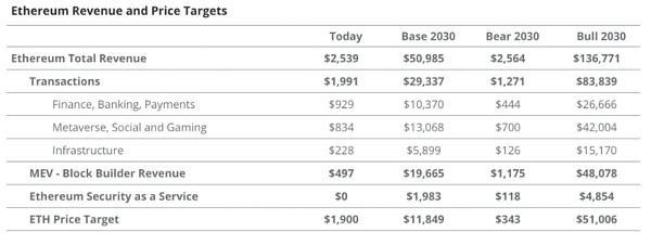 在2023年5月,即其以太坊ETF推出几个月之前,VanEck分析师发布了一份广泛的报告,在报告中,他们分享了对以太坊区块链技术组成部分和前景的研究结果。基于他们的计算以及对ETH加密货币作为未来基础设施“燃料”需求的论据,他们预测了该币的未来价格范围。