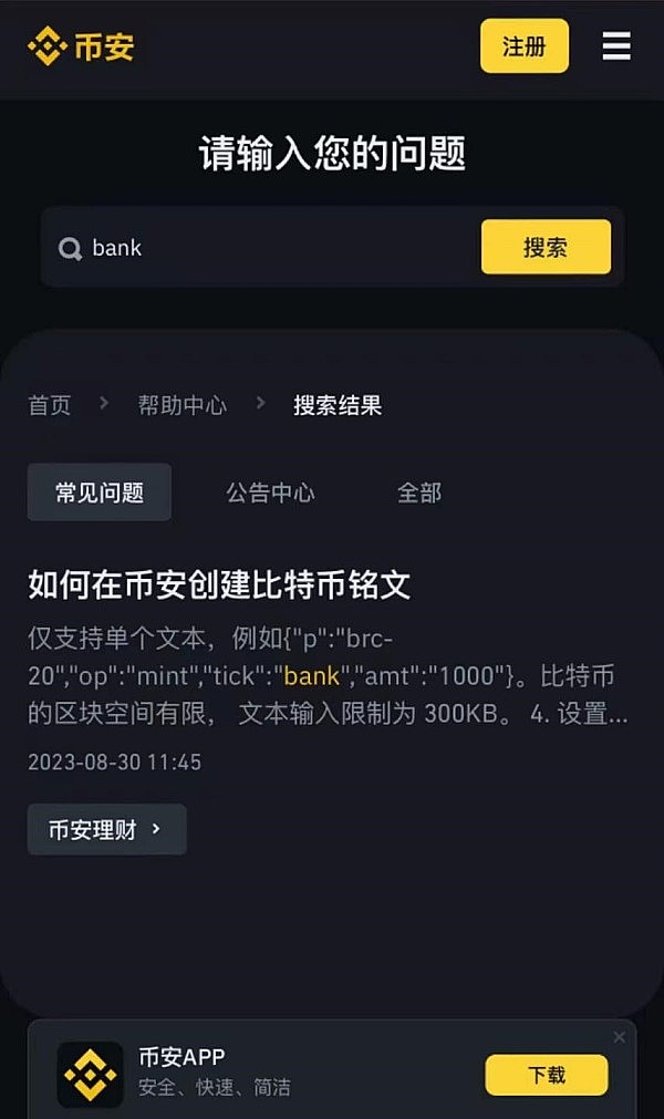 $Bank于2023年5月被芝麻交易所直接上架,与其他同期上架的铭文一起遭遇了至暗时刻,几乎跌至归零,像极了比特币早期的发展历程。直至2023年8月,binance发布了ordinals铭刻教程,“bank”作为示例被公然写进其中,关于bank的来历顿时引发种种猜测。众所周知,binance的创始人cz对btc素有情怀,深知Bitcoin is bank,也对创世版块相当熟悉,那么bank被写进教程,到底是巧合还是有意为之呢?