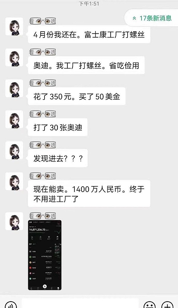 上半年 ORDI 铭文铸造之初,少有人关注,以至于微信群中几十块转让都无人问津。而一位在工厂的朋友,在群里看大家说的热闹,就花 350 元跟人学着打了 30 张 ORDI( 3 万枚 ORDI)玩玩,打完就丢到脑后,继续回厂拧螺丝,直到看到人们都在欢呼ORDI上币安暴涨啦才想起来一看,额的神啊,当初的350已经变成了 1400 万元!他禁不住慨叹,终于再也不用进厂打螺丝了。