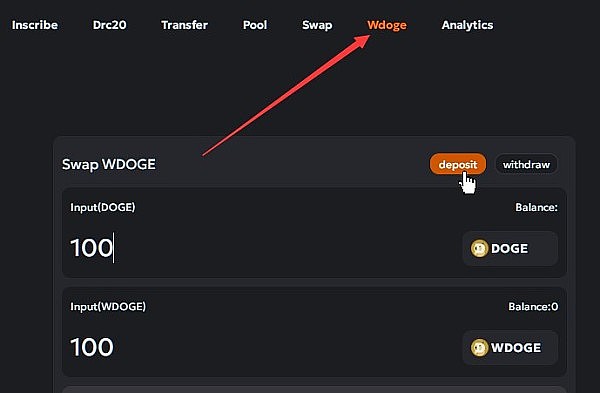 接下来点击网站上方菜单里的Wdoge,如下图所示,我们在这里先要把Doge兑换成Wdoge,输入要兑换的数量,依次点击Swap — — Confirm — — Sign&Send,完成兑换