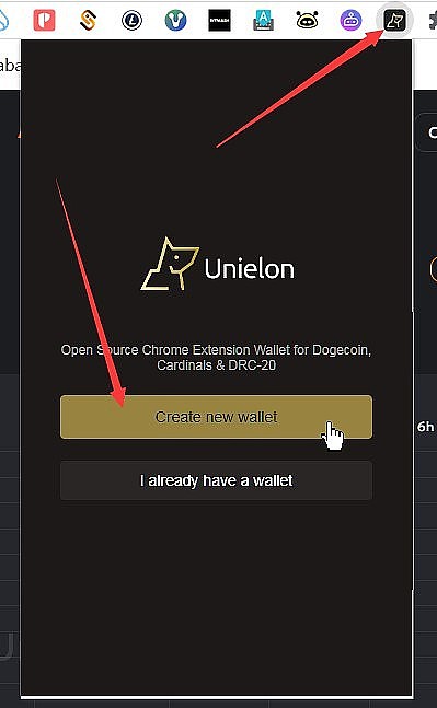 这时会弹出提示,要求你先安装 Unielon Wallet 钱包,点击 Install 进入谷歌应用商店,点击“添加至 Chrome”,安装谷歌插件。安装完毕,点击浏览器上的Unielon Wallet 钱包图标,看下图,是大家熟悉的谷歌插件钱包的初始界面,和常见的MetaMask小狐狸钱包大同小异,点击Create new wallet 创建新钱包