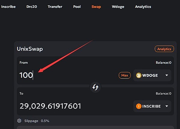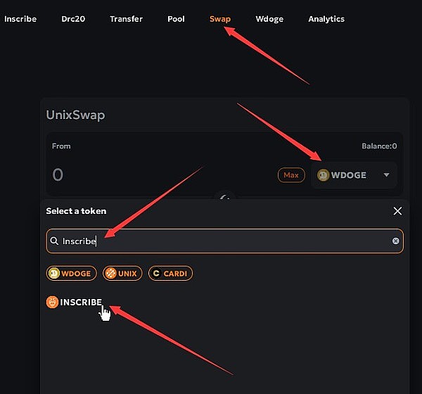 现在我们就可以使用Wdoge来兑换Inscribe,点击网站上方菜单里的Swap,选择使用Wdoge购买,然后如下图所示,搜索Inscribe,然后选中Inscribe