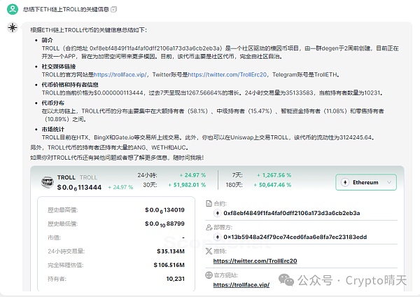 有的alpha代币总有各种各样的钓鱼,合约安全等问题。且有的时候你还是需要了解一下其他的信息,看看网站啥的。比如我们看一下$Troll的基本关键信息,这时候我们可以直接提问,然后可以看到代币的官方网站,基本信息,甚至是合约安全问题,一目了然!!!