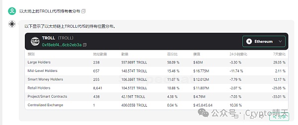 还可以分析这个meme资产的具体的持有人情况,来判断最近这段时间,你的对手方的持仓情况的变化。比如下图看出,$Troll这个代币,大户七天内增持了很多,基本都是从散户那里收集来的筹码,而最近24小时的比例却在下降,应该注意风险了。