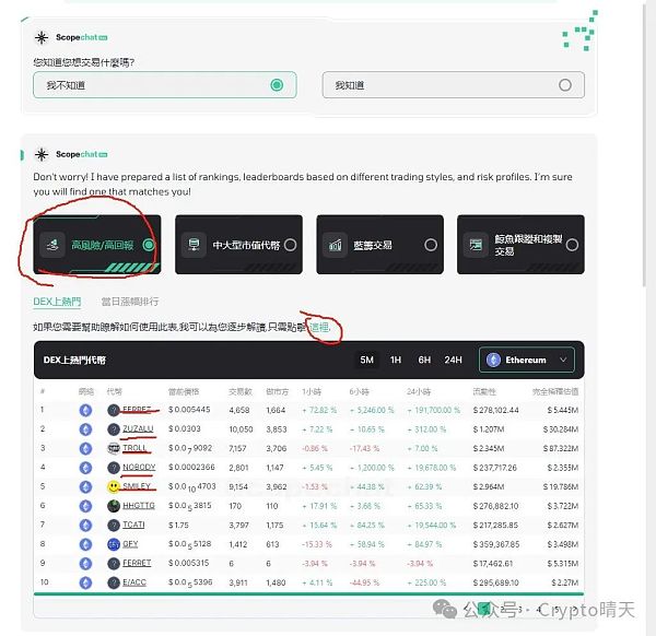 首先打开scopechat,选择degen的交易策略。你会发现1小时内,dex上最火的币种几乎都是meme。这里我们的rank最快可以到5分钟。同时,点击rank上面的here。AI会告诉你这种类型的资产应该看哪些数据。