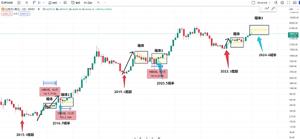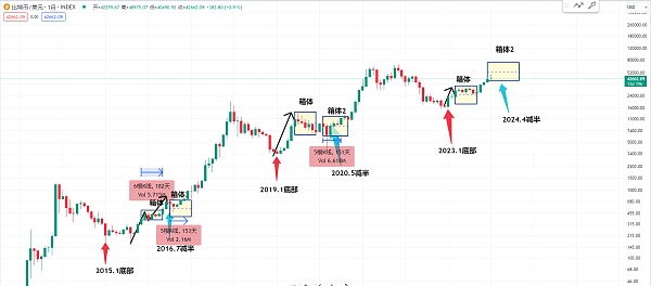 那目前的比特币也算是第一个阶段可能暂时告一段落 就是在产量减半之前有可能是整个大牛市开始的第一个阶段 这边就像2015年一样 这边起来有一个箱体 然后这边再起来 那2023年从15000起来之后这边一个箱体然后再突破 就像2015年的这个位置 他就像一个N形的上涨