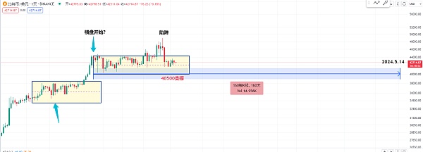 所以这个时间我们要记住 目前我们尽量先看这边的箱体盘整 他这个40500能不能支撑柱