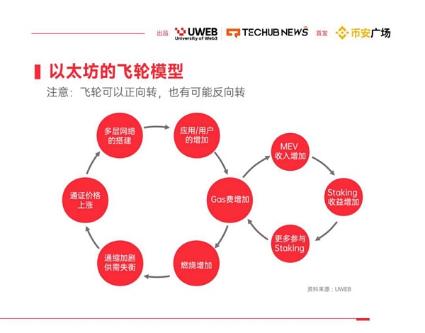 具体而言,以太坊多层网络的搭建使得吸引更多的开发者和更好的开发基础设施,为以太坊生态带来更多的应用(DApp),从而吸引更多的用户使用,进而带来了更多的交易事务量(Transactions)以及更高的网络费用(Gas)。这将使得ETH销毁的增加,从而形成通缩使得供需失衡,ETH价格上涨。另一方面,更高的Gas费也让MEV收入增加,从而使得Staking收益增加,吸引更多人参与ETH的Staking,进一步带动飞轮加速循环。值得注意的是,在发展顺利的情况下,飞轮可以显现出如上正向的循环;但如果在内外部因素遇到问题的情况下,飞轮还可能出现反向的循环。
