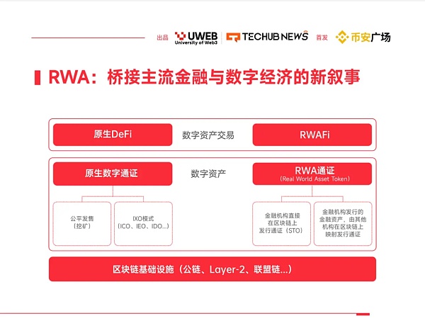 实际上Web3.0所带来的不仅仅是互联网的升级,同时带来的还有全球金融体系的数字化升级,其中的核心要素是数字资产的兴起。 数字资产包括原生数字通证与现实世界资产通证两类。金融机构通过在区块链上发行与现实世界资产相对应的数字资产,来实现现实世界资产的通证化;也可以由金融机构首先发行资产包或完成证券化,再由其他机构将资产包或者证券映射至区块链上形成数字资产,以完成通证化。