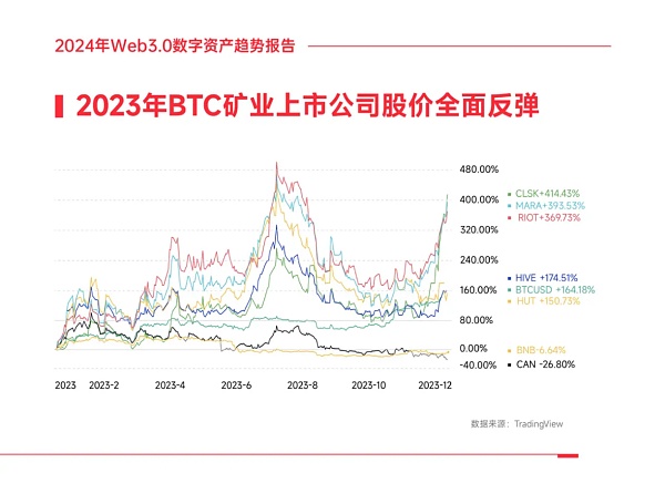 与之相对应的是,上市的矿业公司股票价格同样出现了显著的反弹,但市场对这些公司的评估分化明显,例如头部矿企Marathon Digital Holdings(RARA)和Riot Blockchain(RIOT)在2023年的涨幅分别为393.53%和369.73%,新兴矿企CleanSpark(CLSK)更是达到了141.43%的涨幅,但还有部分老牌上市矿企如Hive Blockchain(HIVE)和Hut8 Mining Corp(HUT)还在跟随比特币的涨幅波动。这表明矿业的增长潜力可能刚刚开始被市场认识到,投资者对于这种变化的理解可能还未到位。