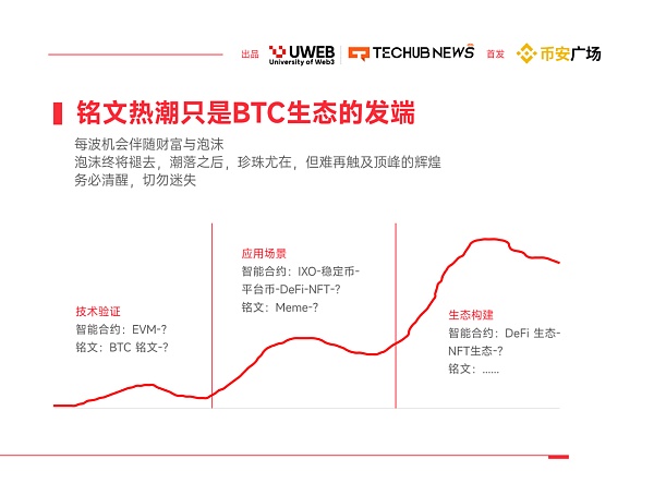总的来说,铭文热潮只是新生态的发端,是数字资产生态中底层创新的第一波浪潮。历史上的每次底层技术革新,往往伴随着三个阶段的发展:技术验证、泡沫形成,最后是市场回归理性。每一波都伴随着巨大的机遇和风险,吸引着资本和创新者的热切关注。在这个过程中,初期的泡沫可能会带来快速的财富增长,但这往往是短暂和不稳定的。随着市场逐渐饱和和理性回归,这些泡沫最终会退去。