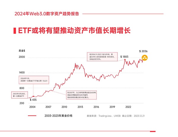 我们可以从历史中汲取经验:自2003年3月28日推出第一支黄金ETF以来,ETF明显为黄金市场带来了长期的利好。2004年11月,美国第一支黄金ETF开始交易(GLD),到2007年,GLD持有的黄金超过600吨,黄金交易量达到1600万盎司,基金份额总值达到145亿美元。2004年11月至2021年11月这七年间,黄金从435美元区间涨至1883美元,涨幅达到333%。这一历史性的增长为比特币现货ETF的未来潜力提供了有力的案例。