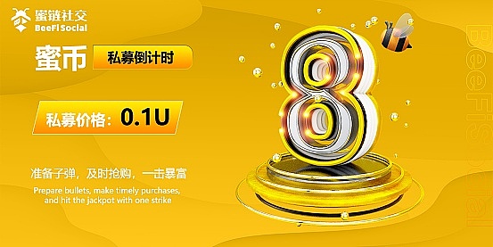 据官方消息:BeeFi社交平台代币-蜜币将于1月26日正式面向全球进行私募,私募价格为0.1$。目前,是私募倒计时的第8天,请所有看好BeeFi和密币的伙伴做好准备,准时开抢!