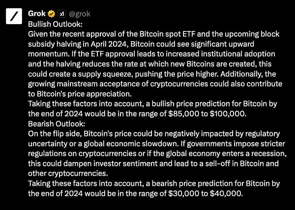 “鉴于比特币现货ETF最近获得批准,以及即将于2024年4月实现的区块补贴减半,比特币可能会出现显着的上涨势头。如果现货ETF的批准导致机构采用率增加,并且减半降低了新比特币的创建速度,这可能会造成供应紧张,推高价格,”Grok分析称。