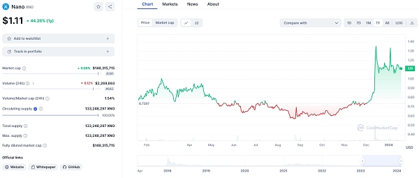 比特币牛市回归下,NANO代币在2023年末反弹冲高,截至周四(1月18日)亚市,NANO价格报在1.11美元,年涨幅达到44.26%。