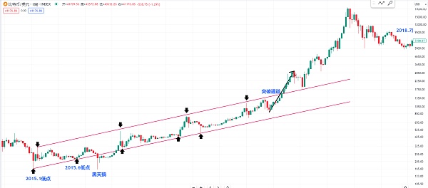 或者目前比特币的通道和2015年的这波牛市非常的相似 我们可以看一下他也是在底部的位置 或者是后面比特币起来之后在2015年的6月份 也是两个低点就可以形成一个上升趋势的通道 这边也有黑天鹅事件被跌破 但是这边最终起来 底部突破之后