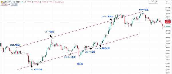 或者是在2021年的这个更高点 然后69000的高点他也是跟2018年的这几个高点形成了一个平行的通道 最终在这个位置崩盘 所以2019年存在着这种大幅波动的情况下 他也是有一个通道在这边