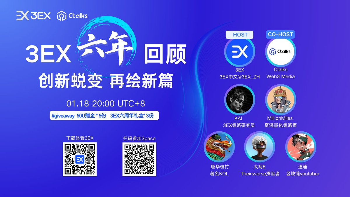 2024年1月18日晚20:00,全球首家一站式AI交易平台3EX联手Ctalks精心策划并组织了一场令人期待的Space圆桌论坛。本次论坛的主题为“3EX六年回顾:创新蜕变,再绘新篇”。在这个夜晚,我们将共同追溯3EX作为全球首家一站式AI交易平台的六年发展历程,深入体会它的创新蜕变,并一同展望未来的新局面。