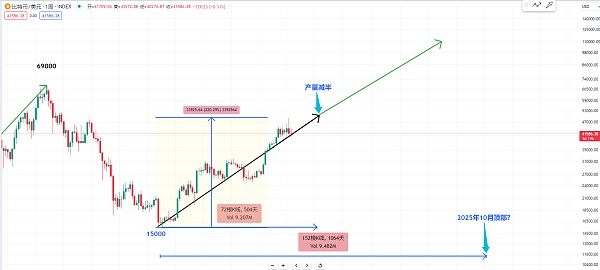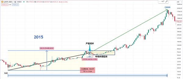 然后我们再来观察一下在2015年的牛市 我们可以看到上半场的上涨他空间也是涨了超过300% 所以根据历史上的经验 每一次在产量减半之前会提前一年上涨 然后在一年左右比特币的涨幅会达到200%到300%左右