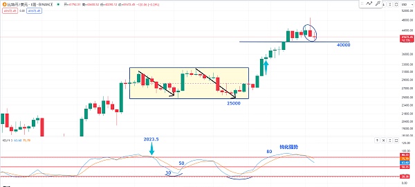 我们可以观察一下比特币在2023年的5月份 蓝色线和橙色线都破了80 后面就会有中线回撤的低点 比如这个25000的低点 或者我们观察比特币的kdj指标 他后面是把50也给跌破了 因为kdj50这个位置是多空平衡区