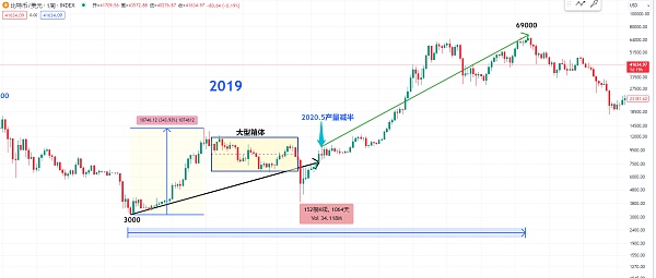 然后我们可以看一下比特币在2019年的第一波上涨 这个中间画出来的位置也是比特币产量减半的时间 在2020年5月份左右 或者我们可以看一下他在上半场的上涨 2019年在3000多美元的底部