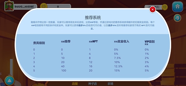 5.通过推荐系统与好友联系:当农作物达到一定数量后,玩家可以推荐好友来玩游戏,达到VIP等级,并通过游戏内的推荐系统获得额外的巨额奖金奖励。每个VIP级别都有不同的条件和奖金率。在最高 VIP 级别,玩家可以获得最多5% 的收获代币价值,以及最多15% 的所有推荐玩家用于购买 NFT 的代币数量。
