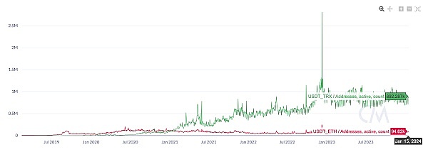 Coinmetrics数据显示,截至2024年1月16日,波场上USDT交易量达180万笔,以太坊约为13万笔,两者相差13.8倍。