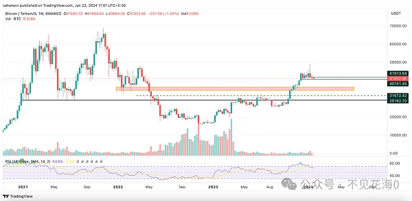 比特币的周线图显示,价格目前徘徊在主要的阻力位和支撑位之间,分别为41,913美元和40,741美元。在支撑方面,40,000美元是强支撑,37,000美元是第一道防线,30,000美元是第二道防线。由于每周相对强弱指数(RSI)呈下降趋势,预计将会有更多的价格调整。尽管成交量继续保持在低位,但看跌活动明显着增加。