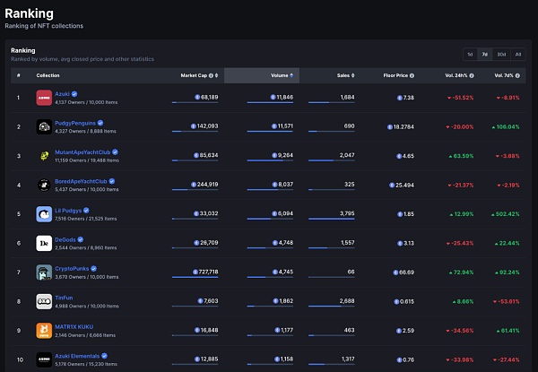 本周 Azuki 位列第一,目前地板价依旧稳定在 7.38e 左右,7d 交易额高达 11,846e;PudgyPenguins 以 11,571e 的交易额位列第二,目前地板价为 18.2784e;MutantApeYachtClub 以 9,264e 总交易额位列第三; 蓝筹 NFT 整体市场交易额和地板价呈稳定上升趋势。