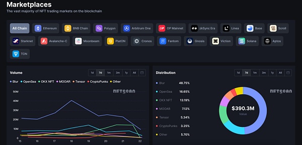 本周:大部分交易市场走势较为平缓,Blur 仍占市场主导,整体交易额在 1 月 18 日达到最高,0:00 时 Blur 市场最高达 4050 万美元,Opensea 最高达 1078 万美元。NFTScan 收录 209 个交易市场 7d 总交易额达 $390.3m,整体较上周($340.3m)有 $50m 的上升区间。本周 Blur 交易额排名第一,市场交易额分布较稳定,排名前六的交易市场及占比分布: