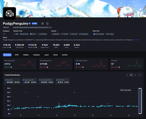 据 NFTScan 数据显示,Pudgy Penguins 目前地板价已达 18.27 ETH,最高成交价 420 ETH,7d 交易额为 11,571 ETH,目前以太坊上总交易额已超 296.4k ETH,过去 7 天交易分布主要为 Blur: 9.93k(87.24%),Opensea: 1.4k(12.33%),LooksRare:25.98(0.23%),X2Y2: 23.5(0.21%)单位 ETH,7d 交易笔数高达 715 次。