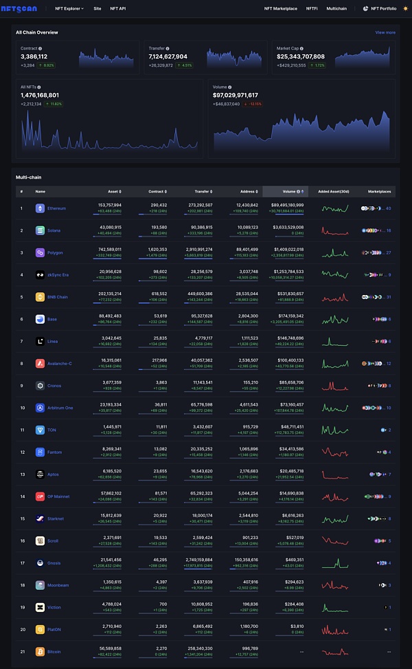 截至 2024 年 1 月 22 日,NFTScan 目前已支持 Bitcoin、Ethereum、BNBChain、Polygon、Solana、Avalanche、Arbitrum、Optimism、zkSync、Starknet、Aptos、Linea、Base、TON、Scroll、Viction、Fantom、Moonbeam、PlatON、Cronos、Gnosis 21 条主流区块链网络,共产生: