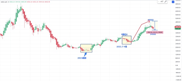 我们先来看一下比特币周线级别的这个heiking ashi图表 从比特币49000的高点跌到了这个39000 价格是下跌了10000美元 而且空间是跌了20% 所以短期下跌幅度有点大的情况下 不排除这个位置有可能会有一波上涨 但是这个位置能不能做多