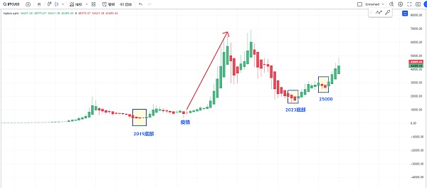 那现在马上要面临比特币的产量减半 周线里面如果有下跌 就类似2023年7月的这种 我的观点是我们到时候一定要选择做多 或者是把手上的空单全部平仓 然后转为多单 利用利润继续做多