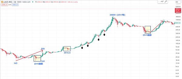 所以我总结简单的方法 低点的位置抄底 转折的位置也可以做多 或者我们可以看一下比特币在2015年的底部也是一样 这个位置本来就有一个转折 2015年前面的160美元到后面的500美元是涨了300多点 区间里面本来是有一个转折 但是后面也是一个黑天鹅事件崩盘