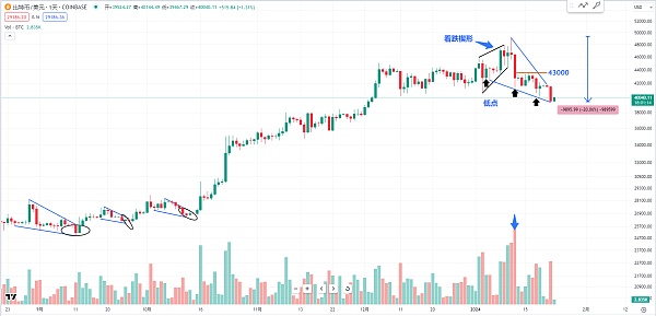 然后我们再来看一下比特币日线级别的这几个楔形的形态 比如高点的位置有一个看跌的楔形 然后这几天又不是很明显 现在空间是下跌了20% 那我们从楔形的形态来观察 从下方的量能可以看出来主力是在骗散户 然后现在根本就不想上涨 就是让他一直在杀跌