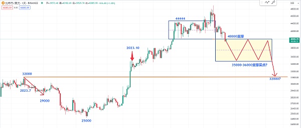 所以我们从4万减去4400美元 有可能理论的下跌空间就是这个箱体跌破 会不会再走出一个箱体到这个35000到36000附近 有没有可能是相对偏中线的一个买点 或者是最差的情况 目前也是有朋友在问 有没有可能会去到32000 我认为最差的情况之下有可能会 因为技术派都能够看懂 也就是前面高点的支撑