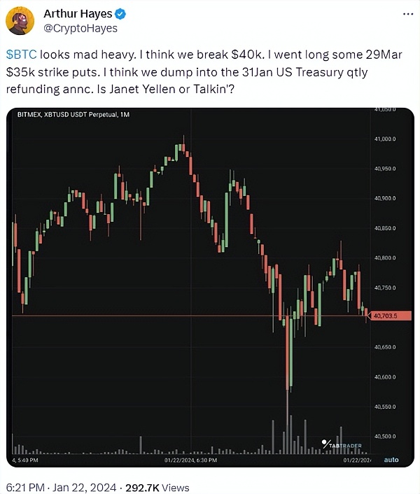 “我买入了一些在3月29日到期的35000美元看跌期权。我认为在1月31日美国财政部发表季度退税公告之前,市场会大幅下跌,”他预测道。