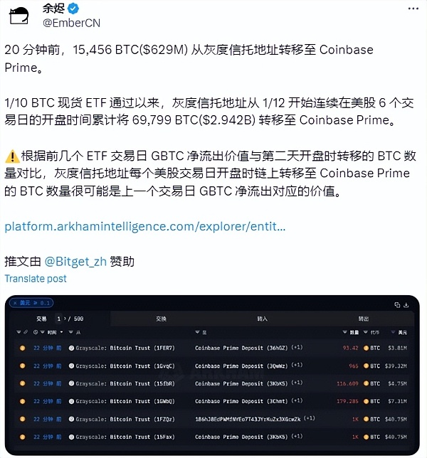 根据链上分析师余烬监测,周一晚间深夜约10点,价值约6.29亿美元的15456枚比特币再次从灰度GBTC信托地址,转移至Coinbase Prime。