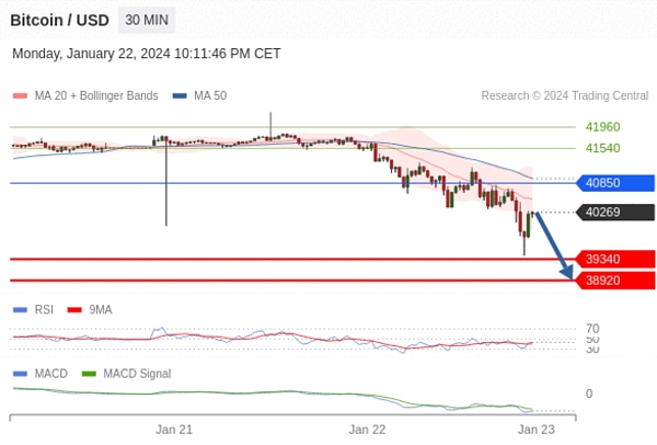 CMTrade表示,比特币RSI低于50,MACD低于其信号线,呈负值。此外,价格低于20和50周期移动平均线,分别为40529和40943美元。