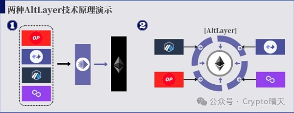 如果你对跨链设施的安全性共享、中继链等概念有所了解,那么将AltLayer理解成Rollup和ETH之间的一层“中继链”会更容易你理解(即下图第二个技术原理演示方案)