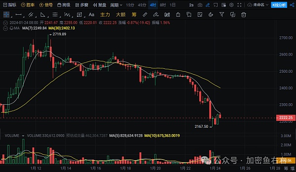 以太坊一度跌破2200 美元,跌幅就更剧烈一些,昨晚最低一度跌破2,200 美元来到2,168 美元。截稿前跌幅有所收敛,近24 小时下跌3.67 %。