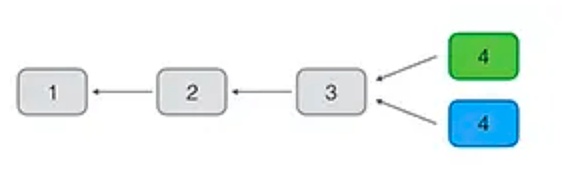 通常,矿工接收先收到的有效区块,由于P2P网络广播的顺序是不确定的,不同的矿工先收到的区块是有可能的不同的。这个时候,我们说区块发生了分叉,在分叉的情况下,有的矿工在绿色的分叉上继续挖矿,有的矿工在蓝色的分叉上继续挖矿: