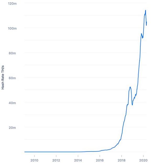 根据比特币每个区块的难度值和产出时间,就可以推算出整个比特币网络的全网算力。比特币网络的全网算力一直在迅速增加。目前,全网算力已经超过了100EH/每秒,也就是大约每秒钟计算1万亿亿次哈希: