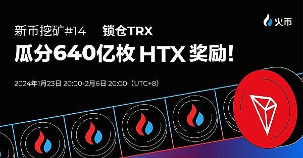 1月23日,HTX上线第14期新币挖矿活动,用户锁仓TRX,即可瓜分640亿枚HTX奖励。